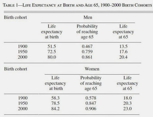 Life expectancy at birth and 65 in 1900, 1950, and 2000