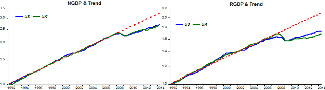 It appears the US and UK have more than a cultural attachment and heritage! Take a look at the evolution of their normalized NGDP and RGDP. The trends are essentially the same for both countries and it is hard to distinguish between them.