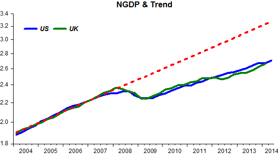 While the US experienced largely a negative demand shock (a shift to the left of the AD curve – a fall in the rate of growth of NGDP below the trend level growth rate)…