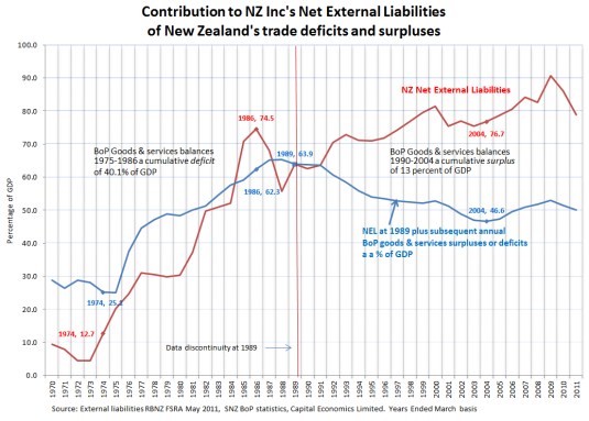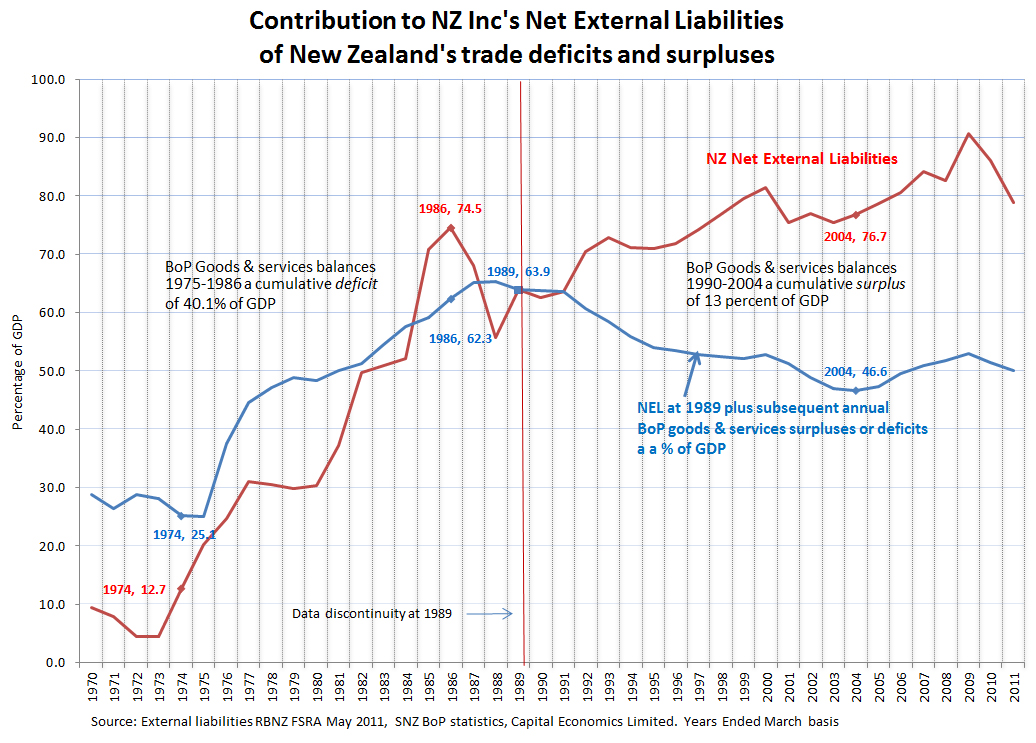 The issue is significant because of the popular myth that the high net external debt ratio today results from a chronic inability of New Zealanders to save enough, for example, in the last two decades. This, it is thought, is the cause of the chronic balance of payments current account deficits since 1974. In reality, what was driving the deficits between around 1990 and 2004 was the cost of serving the net external debt built up by 1990.