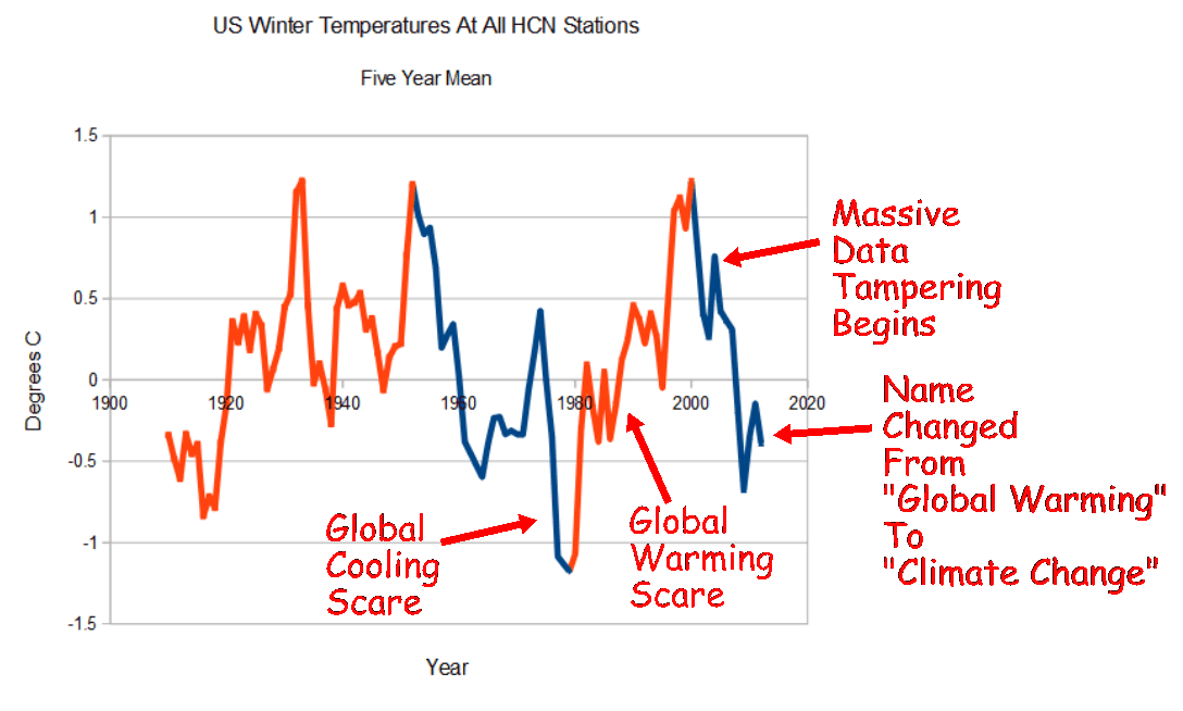 But the data tampering wasn’t enough to keep up with cooling temperatures – so a few years ago they renamed “global warming” as “climate change”