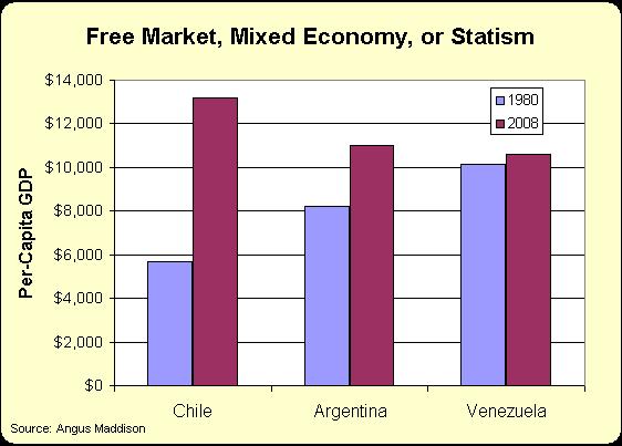 Okay, the title’s an exaggeration, but this chart is rather revealing. It shows how per-capita GDP has changed between 1980 and 2008 in Chile, Argentina, and Venezuela.