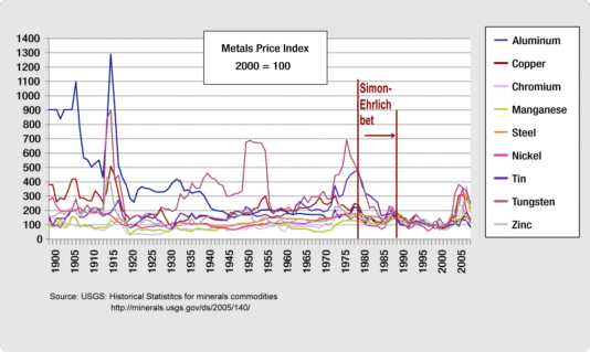 Timing is everything. As demonstrated in the figure, the prices of metals wax and wane over time following an overall downward trend. Regardless, Simon’s point remains true. It is human ingenuity that prevents us from running out of resources – even finite resources. The key is not that prices continue to fall over time, rather that prices reflect consumer desires, and producers, given appropriate institutions…