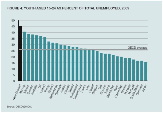 But the chart shows that it is New Zealand that stands out with youth unemployment being 45% of total unemployment, the worst outcome in the OECD.