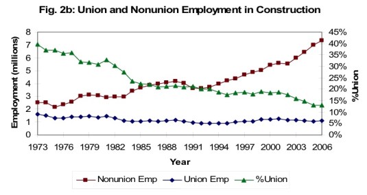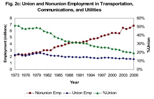 This is the second part of a series of posts responding to Matt Steinglass at the Economist, who put forward some common progressive arguments in favor of more unionization recently. To understand the big picture problem with the argument for more unions, it’s useful to look at the reasons why unions have died out in the first place. One common explanation is that the most highly unionized industries, like manufacturing, have shrunk, and that unionization was simply taken along for the ride. This is not the case however. As Barry Hirsch details, while overall manufacturing employment fell from 20.1 million from 1973 to 15.6 million in 2006, nonunion manufacturing employment rose by 1.5 million. A similar patter persisted in the other main union industries of construction, and transportation/communication/utilities: union employment fell while nonunion employment rose. The graphs below, from Hirsch, tell the story pretty clearly: