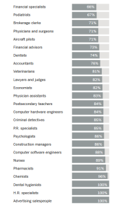 For example, women financial specialists earn 66 percent of men’s pay in the same field, but women pharmacists earn 91 percent of their male colleagues’ salaries.