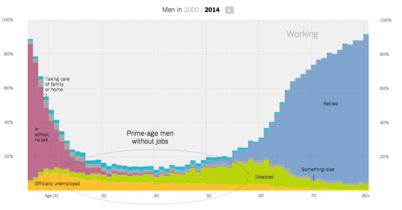 Working, in America, is in decline. The share of prime-age men — those 25 to 54 years old — who are not working has more than tripled since the late 1960s, to 16 percent. … Many men, in particular, have decided that low-wage work will not improve their lives, in part because deep changes in American society have made it easier for them to live without working. These changes include the availability of federal disability benefits; the decline of marriage, which means fewer men provide for children; and the rise of the Internet, which has reduced the isolation of unemployment. …