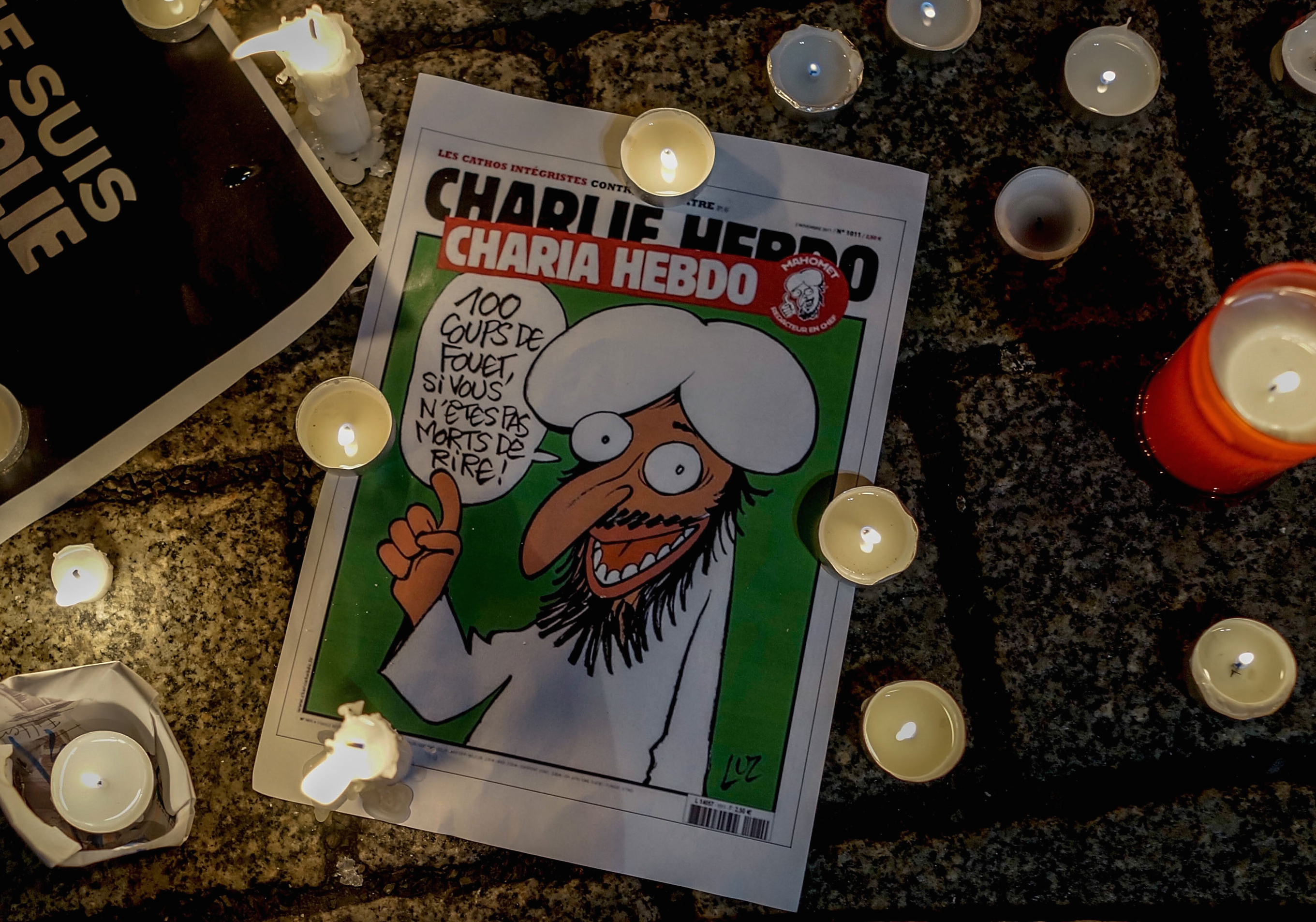 A cartoon lies on the ground while people gather at a vigil in front of the French Embassy in Berlin, Germany following the terrorist attack at the Charlie Hebdo offices in Paris on January 7, 2015. By Carsten Koall/Getty Images. A voxplanation of the edition seen above: