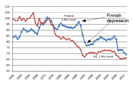 What the 1991-93 Finnish depression and the Lost Decades in New Zealand in the 1970s and 1980s have in common is the reallocation of resources across firms and sectors after terms of trade shocks can be particularly costly in the presence of sticky wages and prices.