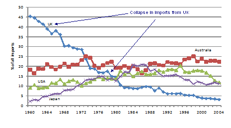Figures 3 and 4 show that the UK moved from the majority trading partner up in the mid-1960s to making up barely 10 per cent of either exports or imports by 1980. Australian and Japanese exports were small until the 1970s and the USA picked up little of the slack.