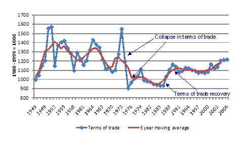 Figure 5 shows that the terms of trade started falling in the mid-1960s with the wool price collapse, spiked in the early 1970s, and collapsed from 1974 and stayed low until the mid-1980s recovery. Kehoe and Ruhl (2003) found that the terms of trade fell by 30 per cent between 1974 and 1980.