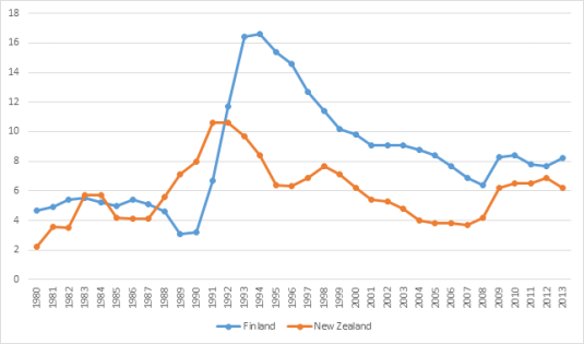 Figure 6: New Zealand and Finnish unemployment rates, 1980-2013