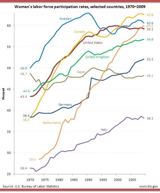 Since 1999, every one of these countries has seen an increase in women’s labor force participation except the United States and Japan: