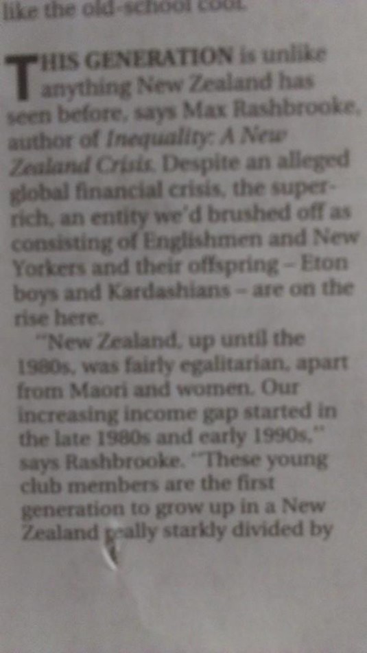 “New Zealand up until the 1980s was fairly egalitarian, apart from Maori and women, our increasing income gap started in the late 1980s and early 1990s,” says Rashbrooke. “These young club members are the first generation to grow up in a New Zealand really starkly divided by income.”
