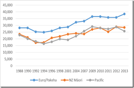 As shown in figure 1 below, between 1994 and 2010, real equivalised median New Zealand household income rose by 47%; for Māori, this rise was 68%; for Pasifika, the rise in real equivalised median household income was 77%.