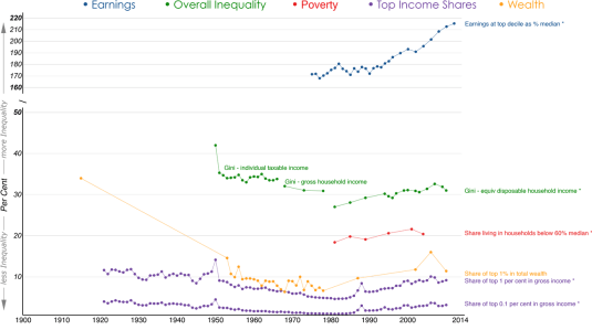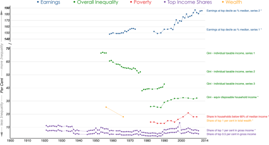 | Has the dispersion of earnings been increasing in recent decades? | Yes, the top decile has risen from 143 per cent of median in 1986 to 186 per cent in 2012. | Yes, top decile of earnings has increased from 175 per cent of median in 1975 to 215 per cent in 2012. |