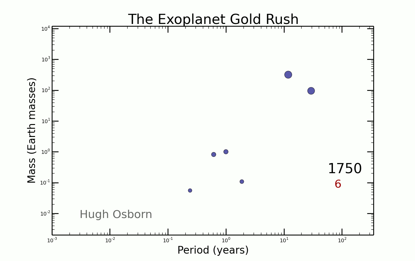 Hugh Osborn, a PhD student on the WASP project at Warwick University, has produced a graphic illustrating the “gold rush” of exoplanet detection in recent times.