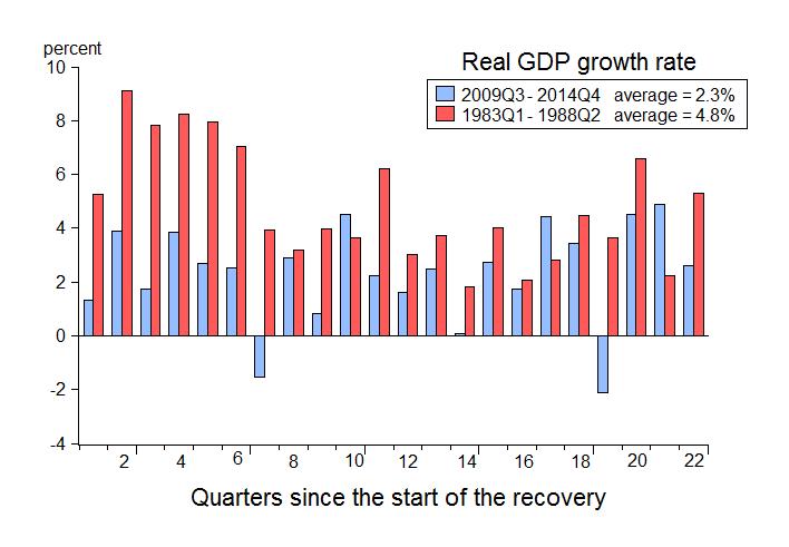 I’ve been tracking the economic recovery with charts and commentaries on this blog since it began in 2009. The simplest but most revealing charts compared and contrasted this recovery with the recovery of the 1980s. Here’s an update of two of those charts. The first shows the change in the employment-to-population ratio,