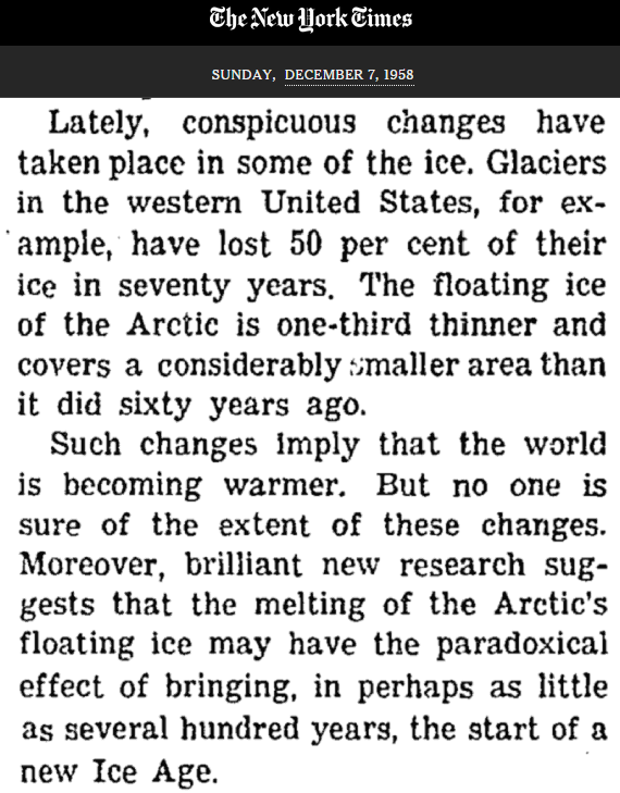 In 1958, the New York Times reported 50 percent loss of glacial and sea ice volume, and said “brilliant research” indicated the disappearing ice was going to cause a new ice age.