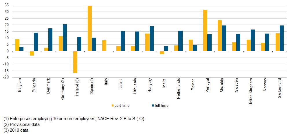 For full-time workers pay gaps varied widely in the EU, by 20 percentage points, between the highest ones observed in Slovakia and Germany (20 %) and the lowest pay gap, actually no pay gap at all, in Italy (0 %).