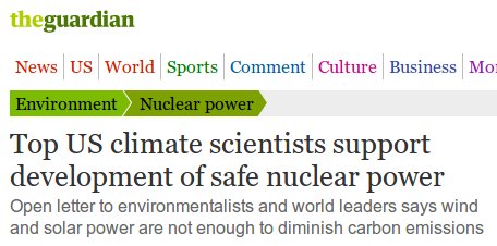 Some of the world’s top climate scientists say wind and solar energy won’t be enough to head off extreme global warming, and they’re asking environmentalists to support the development of safer nuclear power as one way to cut fossil fuel pollution.