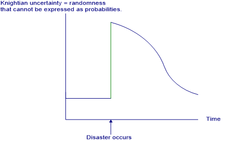 The length of this period of extreme uncertainty depends on the size of the natural disaster and the extent of the damage. As the emergency response and recovery takes hold, more is known about damages, surviving resources, disaster relief requirements and recovery and rebuilding needs now and into the future. Thus the degree of Knightian uncertainty will diminish after the disaster by the falling away of uncertainty after the initial spike at the time of the natural disaster.