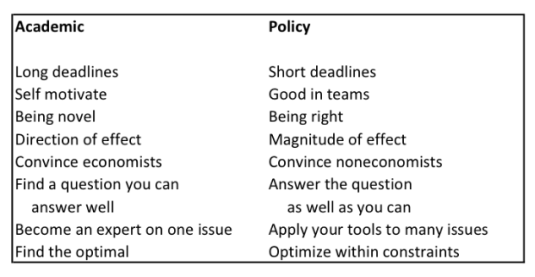 Academia rewards findings that are different and unexpected. In policy it is more important to be right than novel—after all, millions of lives may be impacted by a policy decision. In academia, people argue a lot about the direction of an effect but very little about the magnitude: in policy it’s the reverse…