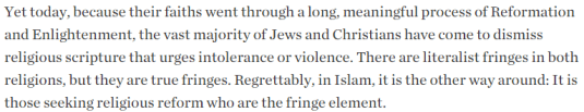 Words are not enough.. Both Jesus and Mohammed lived in societies which had pre-existing religious texts, often exhorting violence. Both men must be understood by their actions as well as their words. Jesus, by his words and actions repudiated violence and urged forgiveness and help for his fellow man. Mohammed urged and required total obedience on threat of death or torture, and waged wars in pursuit of his requirements. The central teaching of Islam, the example of the life of Mohammed, is violent and cruel. The central teaching of Christianity, the life of Jesus, is peaceful and forgiving. To “reform” Islam would require removing the life and actions and many of the words of Mohammed. This is nonsense. Islam must be expunged or civilization will die.