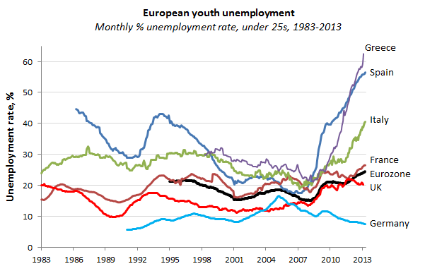 Youth unemployment is bad for all the obvious reasons, including the big loss to future productivity and earnings. But Europe’s youth unemployment is strange, because we’ve never seen a generation *this educated* also be this unemployed. Nearly 40 percent of Spain’s 20-and early-30-somethings are college educated. In Greece, it’s 30 percent. Europe’s crisis — clearly worsened by its austerity obsession — is an absurd waste of the most educated generation in the continent’s history.