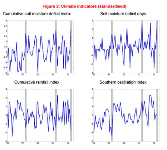 Over the last 15 years, a number of papers at the Treasury and Reserve Bank of New Zealand have explored the role of droughts in the New Zealand business cycle, such as the drought in 1997.