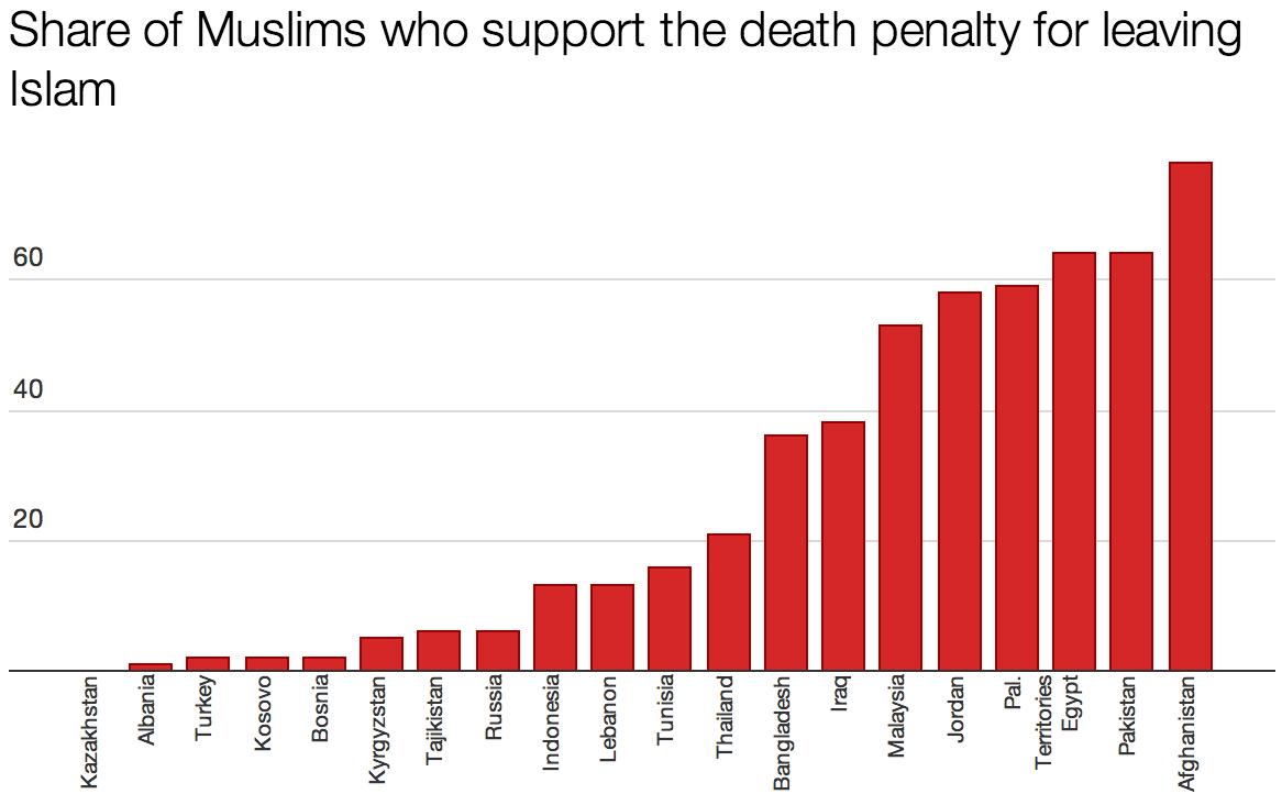 According to Pew’s data, 78 percent of Afghan Muslims say they support laws condemning to death anyone who gives up Islam. In both Egypt and Pakistan, 64 percent report holding this view. This is also the majority view among Muslims in Malaysia, Jordan and the Palestinian territories.