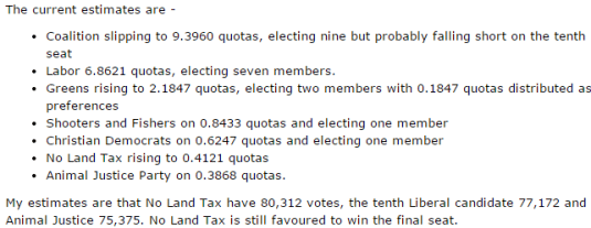 In Tasmania, my home state, the Legislative Council as single member constituencies with two or three vacancies filled every year but is full of independents elected the six-year terms. The political parties having no chance of getting candidates elected in front of them. The Tasmanian voters simply don’t vote for party candidates in the Legislative Council elections. Out of 15 members, there is one Liberal Party member, and two members from the Labour Party