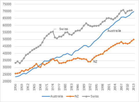 Figure 1: Real GDP per New Zealander, Swiss and Australian aged 15-64, converted to 2013 price level with updated 2005 EKS purchasing power parities, 1.9 per cent detrended, 1956-2013