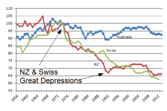 New Zealand and Switzerland have had the worst growth performance of any OECD member country since the 1970s. The Swiss have been in continual economic decline more or less since 1973.