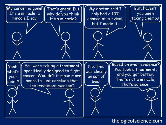 Human beings like to have explanations for everything, and we find seemingly inexplicable events extremely troubling. We disdain the notion that some things just happen without any rhyme or reason for them. This dependency on meaningful events makes us prone to contriving and accepting supernatural explanations even though science offers us explanations that are more satisfactory (although often less comforting). I am, of course, talking about our tendency to claim that an event was a miracle. When an improbable event occurs, such as a “miraculous” recovery from cancer, people of many different faiths and religions are quick to claim that the recovery was a result of some form of supernatural intervention, rather than merely a product of statistical probability. That should not, however, be our default. Any time that science offers an explanation, we should default to it rather than proposing a divine plan that is being supernaturally orchestrated.