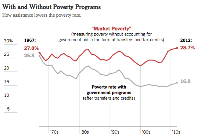 One way is that the various programs associated with the War on Poverty have succeeded, at least to some extent. That success can be seen in the difference between the “market poverty” rate (technically, the pretax/pretransfer anchored supplemental poverty rate) of 28.7 percent in 2012 and the “poverty rate with government programs” (technically, the anchored supplemental poverty rate) of 16 percent. Many fewer people are living at or below the poverty line with government transfers and tax credits than if those programs had not existed.