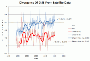 Over the past 21 years, GISS is warming four times faster than the troposphere, where global warming is supposed to be occurring.