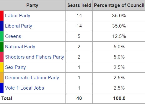 The 40 member Victorian Legislative Council is a mixed bag with the balance of power depending on which particular combination of Green plus minor party legislative councillors get together to support the governing Labour Party government. I must admire the Vote 1 Local Jobs party as a brand name.