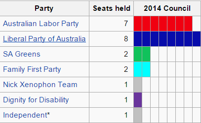 In the 22 member South Australian Legislative Council, neither of the major parties are particularly popular, nor are the South Australian Greens. To pass a bill with 12 votes, the Labour Party government must string together its seven members with a combination of the South Australian Greens, the Family First Party, Dignity for Disability, an independent and the Nick Xenophon team. Good luck.