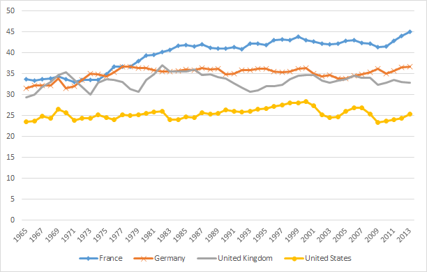 Figure 1: Tax revenue as percentage of French, German, British and US GDP, 1965–2013