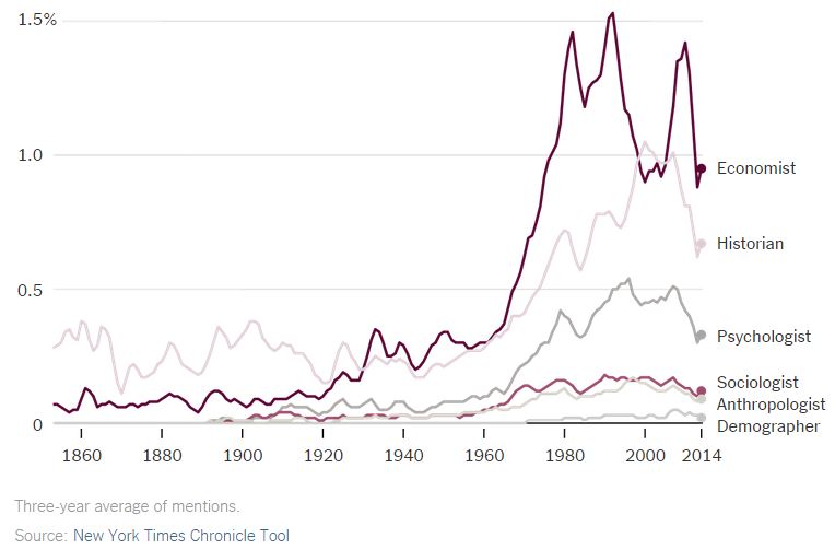 The economist Justin Wolfers, writing for the New York Times Upshot, reports that economists increasingly outnumber other social scientists in mentions in the both the Times and — even more — in the Congressional Record. About 1% of Times stories use the word “economist,” more than three-times as often as they write “sociologist.” Here’s his figure tracking Times references: