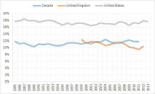 Figure 1: relative poverty rate (% of persons living with less than 50% of equivalised disposable income), USA, UK and Canada