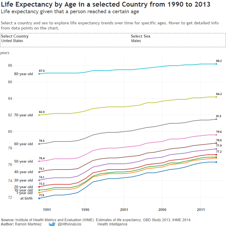 via Life Expectancy by Age in selected Country from 1990 to 2013 | Health Intelligence.