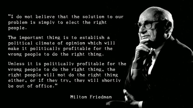 «I do not believe that the solution to our problem is simply to elect the right people. The important thing is to establish a political climate of opinion which will make it politically profitable for the wrong people to do the right thing. Unless it is politically profitable for the wrong people to do the right thing, the right people will not do the right thing either, or if they try, they will shortly be out of office.» – Milton Friedman