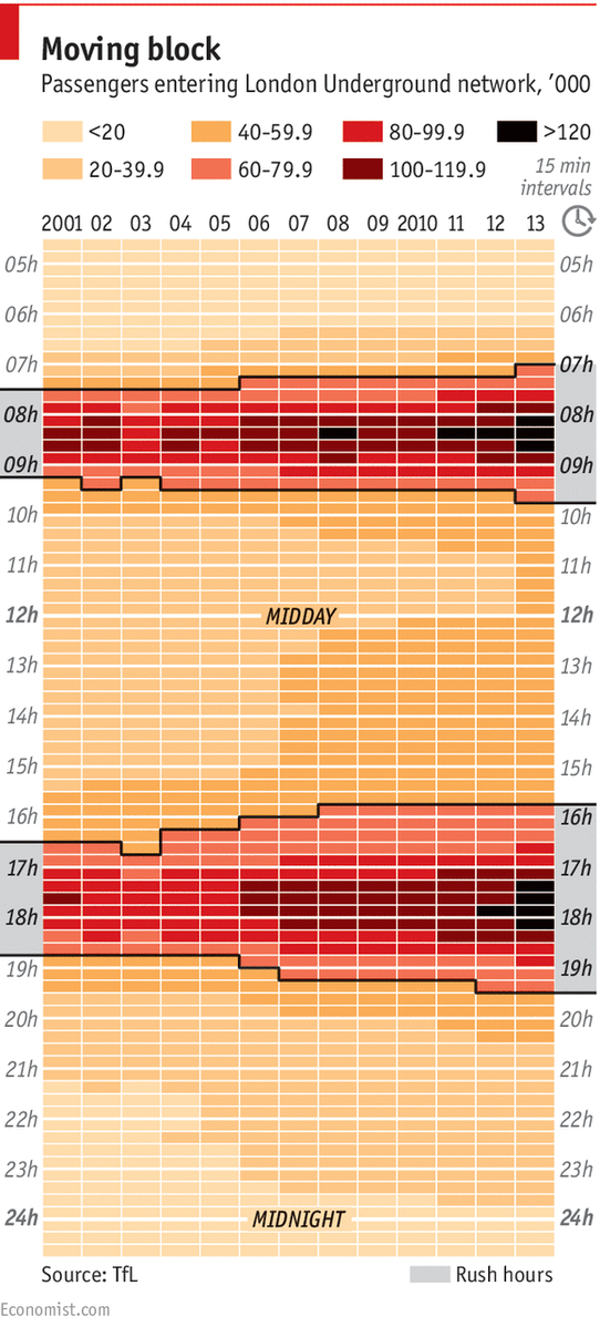 Thanks to an article in the Economist, retweeted in the context of yesterday’s Tube strike, I now have some data to back up my hunch. Since 2001, the number of people using the Underground has increased and so has the length of the rush hour. It’s more like a rush three hours now. As passenger numbers have increased at peak times, the number of people leaving early or delaying their journeys has also risen. In just over ten years, the volumes have shifted at each end by about half to three-quarters of an hour, so 6.15am now looks like 6.45am used to.