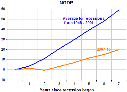 Not so fast Kevin. The chart below compares Aggregate Nominal Spending (NGDP) on the same basis.