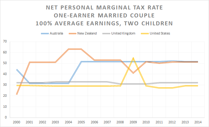 Marginal tax rates of a nuclear family in USA, UK, Australia and New Zealand since 2000