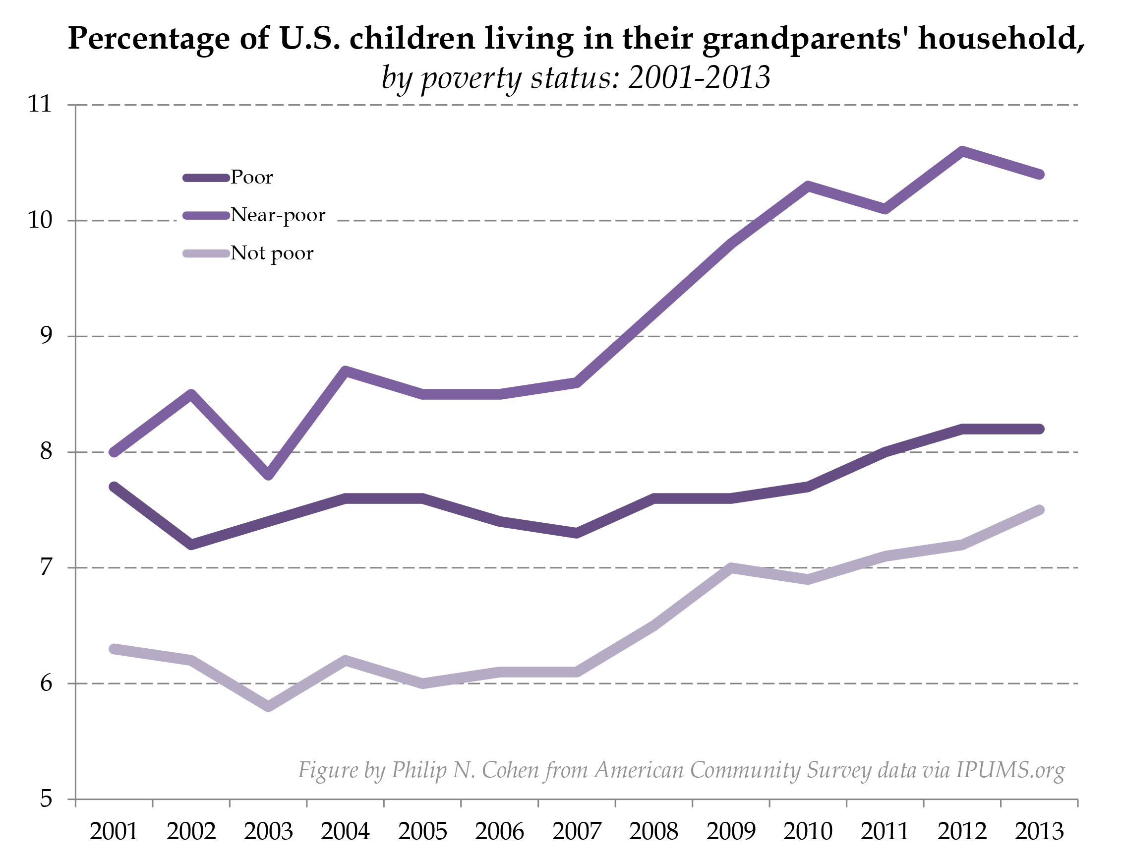 I felt guilty this afternoon when I noticed a lot of people clicking on this old post about Grandparents Day. I should have updated it sooner. Better late than never, here is the updated trend of children (ages 0-14) living in the households of their grandparents, by poverty status:
