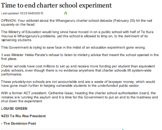 The New Zealand teachers union went into a very curious rant against chartered schools in a letter to the Dominion Post today. Instead of saying that they do not improve student outcomes, the usual propaganda, the author of the letter focused on system-wide outcomes after the introduction of charter schools.