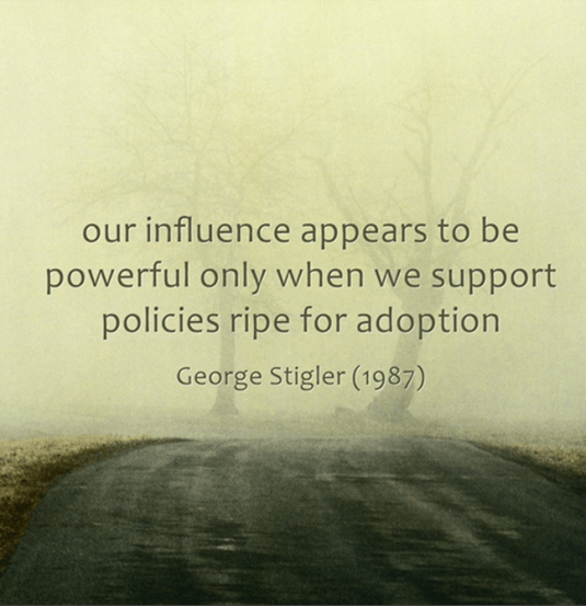 Stigler argued that ideas about economic reform needed to wait for a market. He contended that economists exert a minor and scarcely detectable independent influence on the societies in which they live. As is well known, Stigler in the 1970s toasted Milton Friedman at a dinner in his honour by saying:
